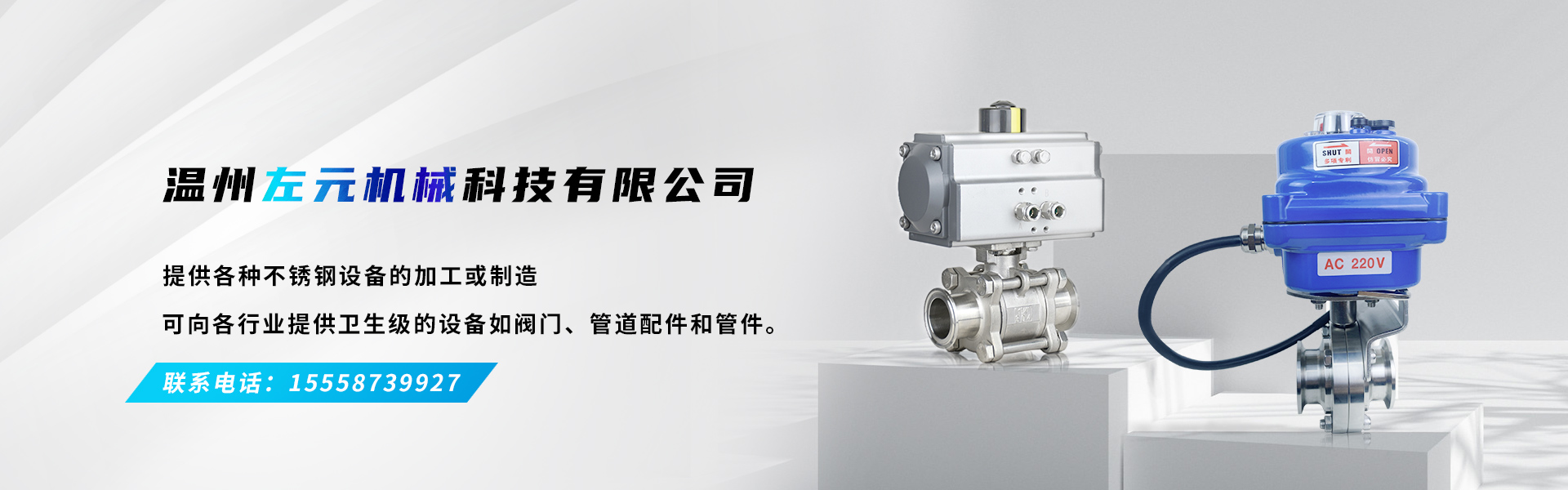 溫州左元機械科技有限公司成立與 2015 年,位于浙江省溫州市濱海園區十四路,主要經營包括衛生級手動球閥、氣動球閥、電動球閥、衛生級手動蝶閥、氣動蝶閥、電動蝶閥、衛生級取樣閥、卡箍、管支架, 以及灌裝設備系列,管件系列等